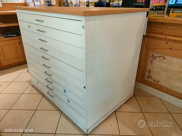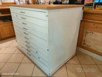 Mobile adatto a negozio, per riporre fogli colorati sacchetti e carta regalo, molto robusto e ben fatto, contiene fogli A0, cassettoni appoggiati su guide. Adatto a cartolerie, uffici, studi, artisti. Prezzo da concordare.