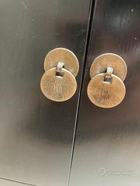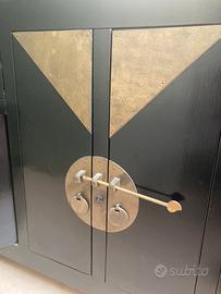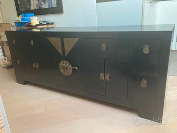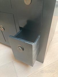 Mobile in legno lucido nero Maisons du monde alto 62 cm, lungo 160 e profondo 48 cm. È provvisto di 6 cassetti e 3 portelle tutti di diverse altezze . I dettagli lo rendono un complemento d’arredo unico nel suo genere e ormai introvabile nei negozi