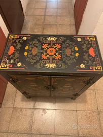 Mobilino cinese realizzato su tre lati a motivi floreali a lacche colorate,con due sportelli frontali e due vani Interni separati da mensola.misure cm 60 x30 x 73.ritiro sul posto, non spedisco.