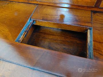Vendo splendidoTrumeau . Il mobile è composto da una parte inferiore con tre grandi cassetti mossi, una ribalta che cela un vano scrittoio, e una parte superiore a due ante vetrate con scaffali interni, ideale per esporre oggetti di valore o porcellane.Cassetti ed interni delle 2 vetrate sono in fine tessuto dorato,finemente lavorato.