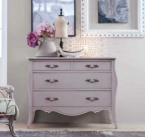 Raffinato comò con quattro cassetti (2+2), dal sapore provenzale vintage, realizzato artigianalmente in legno massello.