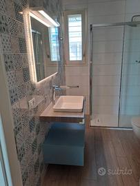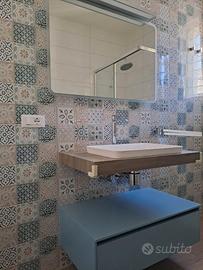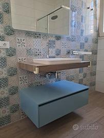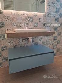 Mobile da bagno composto da: specchiera con luce incorporata 102 x 75; lavabo rettangolare posato su ripiano in legno 52 x 85; cassetto scorrevole portaoggetti 52 x 85. Smontato e imballato con cura.