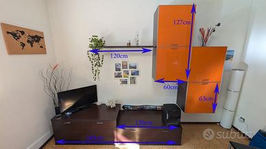 Vendo mobile completo da sala da pranzo o salotto in buone condizioni, composto da: - nr. 1 mobile cassettone a doppia altezza appoggiato a terra (una parte con ante, l'altra con due cassettoni capienti), color legno scuro - nr. 2 pensili sospesi abbinati color arancione, con anta in vetro - nr. 1 mensola, color legno scuro Misure e dimensioni riportate direttamente sulle foto. I pensili sono perfetti, all'interno hanno ripiani in vetro. Il mobile cessettone presenta alcuni piccoli segni di usura. Nel complesso mobile in buone condizioni. Si trova già smontato e imballato da una ditta di traslochi in garage (quindi non c'è necessità di fare spostamenti dei mobili su e giù dalle scale, solo caricarli in un furgone sufficientemente spazioso). ✅ Disponibile da subito ✅ Visionabile senza impegno ✅ Disponibile per qualsiasi domanda o chiarimento ✅ Prezzo trattabile 📍 Ritiro a carico dell'acquirente – zona Medicina (BO)