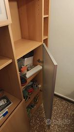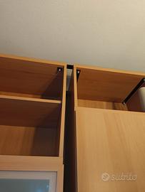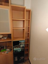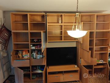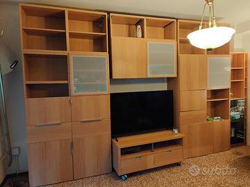 Mobile componibile IKEA "a ponte", ideale per il soggiorno, perfetto per organizzare TV e libri e utensili per la cucina. Mobile in buone condizioni, no marcati segni di usura (esempio vanno registrate cerniere e scorrimento cassetti) Prezzo di 350 euro trattabile. se interessati, fino al primi di maggio, il mobile rimarrà montato e visionato nella sua interezza. si venderà smontato, a meno che l' acquirente se ne voglia prendere carico. Mobile principale. - Struttura in legno, composta da 3 moduli da circa 1,25 metri ciascuno, fissati con staffe "aeree" superiori come da foto (lunghezza totale mobile è di 3,70 metri, altezza 2,55 metri, profondità 42 cm circa) - Ante in vetro opaco e legno. - Ripiani in legno (ognuno largo internamente 56 cm) - 3 cassetti profondi - Colore betulla( beige). - Dotata di scala IKEA in metallo a pioli compatibile al mobile Consolle TV mobile, con ruote, due cassetti. Escluso dal mobile IKEA, ma si regalano se interessati due mobiletti come ultime due foto: 1' con scansie e anta in vetro (altezza 200cm*larghezza 40cm* profondità 28,5) 2' mobiletto porta CD (altezza 200 cm*20cm*17cm Se interessati contattare tramite subito o tramite whatsapp (lavoriamo su turni, ricontattiamo il prima possibile) Lorella 3497657527 Elisa 3492913888