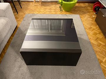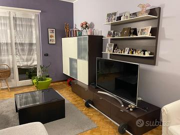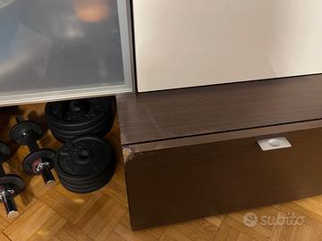 Mobile in legno wengè, composto da piano porta TV con 4 cassettoni, boiserie con 3 ripiani e 6 cubotti con ripiani interni e ante color latte e vetro + tavolino basso. E’ in buono stato, ma presenta un angolo del piano porta TV rovinato come visibile in foto. Smontaggio e trasporto a carico dell’ acquirente. Posso consigliare un montatore.