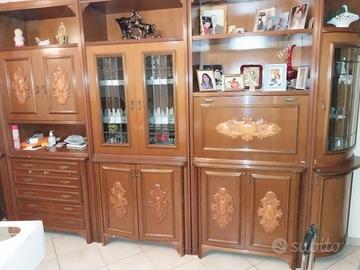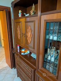 Mobile sala anni ' 70 - ' 80 in legno lucido. Lungo cm . 330, alto cm. 220, con una profondità di cm. 50. È componibile per cui può essere usata anche solo la vetrinetta e le due estremità diventano angoliere. Nella parte orizzontale tratteggiata con pennarello blu c' è un mobile bar.