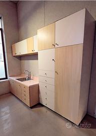 Mobile componibile, a moduli, quindi adattabile ad ogni composizione. Color bianco e legno chiaro, in ottime condizioni, perfetto per soggiorno, ingresso, cucina, studio e camera.