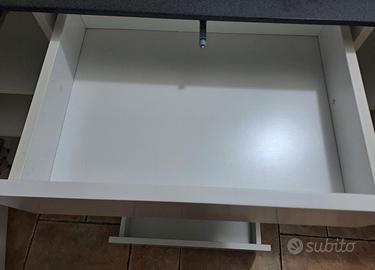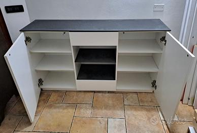 Mobile bianco con piano superiore e 2 mensole centeali grigio effetto granito.