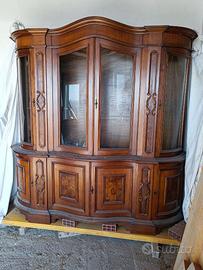 Mobile vetrina/dispensa in legno massello con bellissime ante bombate, ciò che rende molto particolare questo mobile è che anche i vetri installati nelle ante sono bombati. Questo mobile vetrina/dispensa non è facile da reperire vista la particolare sinuosità delle ante sia nella metà superiore del mobile che nella metà inferiore del mobile. Il trasporto è facilitato grazie alla possibilità di separare la parte sopra (vetrata) dalla parte sottostante (completamente in legno).
