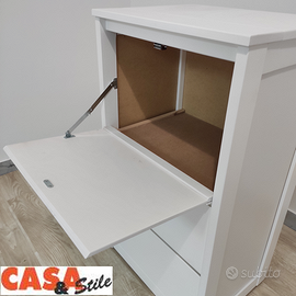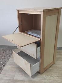 Mobile realizzato interamente in faggio massello Colore Noce Frontale cassetto e anta in multistrato di betulla con taglio a 45°. Apertura dell'anta per riporre il ferro da stiro 45 cm di larghezza x h 35 cm