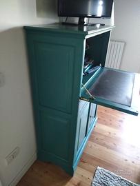 Mobile vintage, ottimo d'arredo per il suo stile, con 2 ante e 2 cassetti oltre che uno scrittoio che scende per l'occasione. Colore turchese, misure del piano superiore larghezza 90 e profondità 42 cm, altezza 131 cm