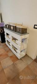 Mobile fai da te, costruito con due pallet epal usati e quattro cestini in vimini.