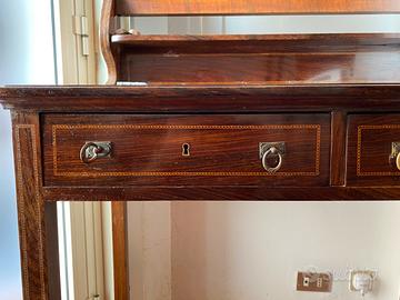 Tavolino antico da toilette con specchio, due cassetti. Legno in ottime condizioni, lo specchio è un po’ ossidato. Misure: larghezza 93 cm, profondita 49 cm, altezza 150 cm (di cui 83 il solo tavolino, 66 lo specchio).