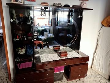 Vendo elegante mobile in legno scuro con ampia specchiera e cassettiera integrata.