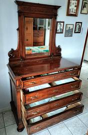 Mobile con specchio vintage in legno lavorato a mano in ottime condizioni con quattro cassettoni. Misure mobile: larghezza 118 cm, altezza 103 cm e profondità 58 cm. Misure specchio: larghezza 113 cm e altezza 94 cm.