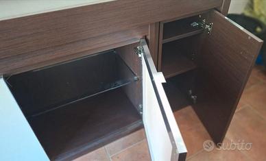 Inoltre il mobile ha varie ante con ripiani in vetro, molto spaziose e il piano superiore può sostenere pesi elevati come una tv di tanti pollici.