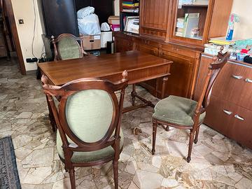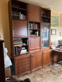 Arredamento per studio in legno massello. Mobile largo 203 cm, profondo 45 cm e alto 280cm. Scrivania 120 cm x 65 cm, alta 79cm. 2 sedie senza braccioli e 1 sedia con braccioli. Vendo in blocco. Solo ritiro a mano.