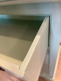 mobile cassettoni in legno massello con tre cassetti pitturato di verde pastello maniglie in ferro lavorato, color marrone. misure: larghezza 108cm, profondità 50 cm, altezza 90.