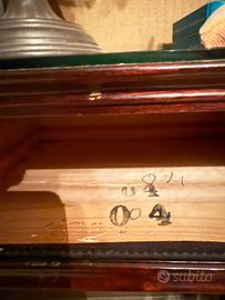 Il mobile presenta tre cassetti centrali, eleganti gambe tornite e una finitura scura patinata dal tempo, che ne valorizza il carattere e l’autenticità.