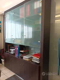 Mobile contenitivo per ufficio realizzato con cura da artigiano falegname locale. Struttura e ante basse in wengè massello, ante superiori in vetro temperato. Dimensioni: largh 200, alt. 250, prof. 35 Vendesi causa ridimensionamento locali. Disponibili altri moduli della stessa serie in annunci a parte. Valore all’acquisto superiore ai 5000,00 EUR, si vende 480,00 EUR. Ritiro a cura dell’acquirente.