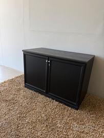 Elegante mobile basso a due ante con serratura, ideale per soggiorno, ingresso o studio professionale. Materiale: Struttura di alta qualità in legno con finitura nera spazzolata (venature naturali in evidenza). Design: Stile classico-contemporaneo con ante a telaio e pomelli satinati.