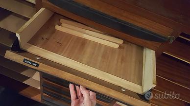 Mobile vintage anni '60, dalla particolare costruzione di 10 cassetti con frontalino a ribalta estraibile. Struttura in legno di mogano verniciato opaco, con 2 ante laterali con chiusura a chiave, vano a giorno superiore. Maniglie in metallo nere, serratura di bloccaggio cassetti senza chiave. Antine laterali con chiave, cerniere a scomparsa tipo "pivot". 8 + 8 ripiani interni in legno compensato, supportati da reggipiani con cremagliera di legno. Base con piedini in metallo verniciati neri.