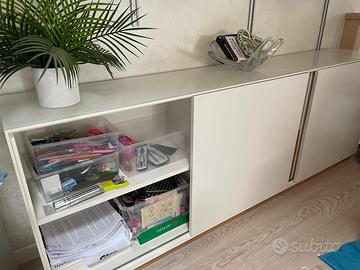 Mobile contenitore cassettiera bianco e legno e ante scorrevoli, con vetro ed eventuale sua mensola - da appendere Profondità 34,5 Lunghezza 2,10 H 71