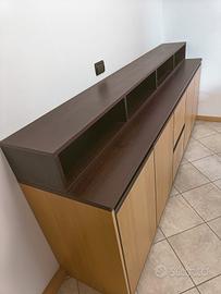 Mobile contenitore di elevata qualità, cm 250 x 50 x H 100. Ha quattro ante battenti e cassettiera centrale a quattro cassetti, interni in bilaminico ed esterni in faggio con particolari in wenghe. Completo di frigo bar interno con anta a traino ed eventuali nicchie superiori alte 20 cm e profonde 30 cm (in foto sono i rettangoli posti sopra il mobile).