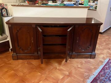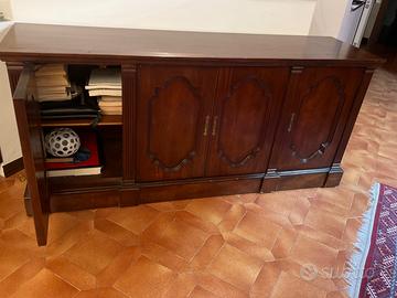 Questo mobile è un classico mobile contenitore in legno, probabilmente utilizzabile come credenza o armadietto, caratterizzato da pannelli con modanature decorative e maniglie in metallo.
