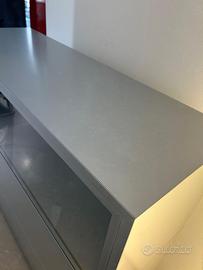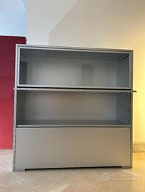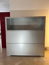 Madia composta da elementi modulari con pannelli in alluminio sovrapposti con un'anta aperta e due chiuse. Le ante e i frontali sono in alluminio.