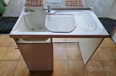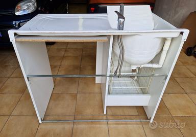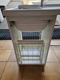 Mobile coprilavatrice con lavatoio e rubinetto. Piano inclinato removibile e cestello estraibile. Anta smontata solo per facilitare la movimentazione. Tutto funzionante ma visibilmente usato, non lo metterei in cucina ma in lavanderia si.