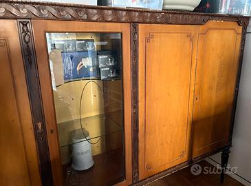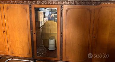 Mobile credenza anni '60 a cinque ante, la centrale vetrata. Materiale legno rovere/noce. Dimensioni lunghezza 250cm, altezza 147cm, profondità 46cm, altezza gambe 38cm, ante 90x47cm. Buone condizioni generali; qualche piccolo restauro necessario.