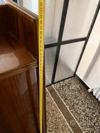 Mobile credenza con scrittoio a ribalta, cassettiera e varie mensole, interamente in legno biondo. Modernariato italiano anni ‘60 con lievi segni del tempo. Fattura originale con etichetta posta sul retro che ne dimostra l’autenticità (prodotto a Chiavari)