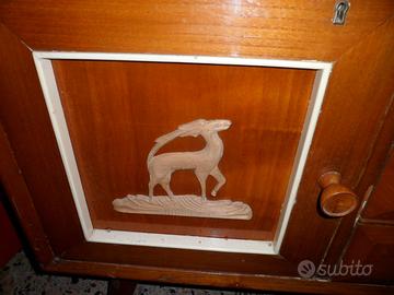 Vendo mobile d’epoca in legno con decorazioni in legno più chiaro raffiguranti animali. Ha 2 ante ai lati che si possono chiudere con chiavi e 3 cassetti al centro. Sorretto da gambe. Misure: larghezza m. 1,54; profondità cm. 46; altezza m. 1,05. Necessita di qualche restauro.