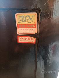 Credenza cinese di legno laccato decorata di metà 1900 usata in buone condizioni (alcuni piccoli segni di usura), presenta due aperture laterali che nascondono 2 grandi scompartimenti a testa. Il mobile è stato prodotto dalla Jinlong Beijing Gold Inlaid Lacquer Furniture Factory ed è localizzabile temporalmente vicino agli anni 50. Le decorazioni in rilievo sono realizzate in pietra ollare. Per misure dettagliate, info per il trasporto e ulteriori informazioni chiedere su whatsapp.