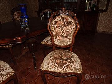 Credenza da salotto in legno, molto bella con vetri molati. In aggiunta tavolo in legno con 6 sedie rivestite in velluto. Tutto in ottime condizioni. Non si spedisce