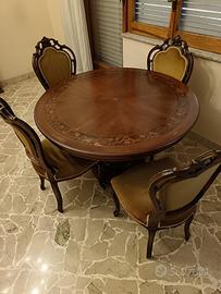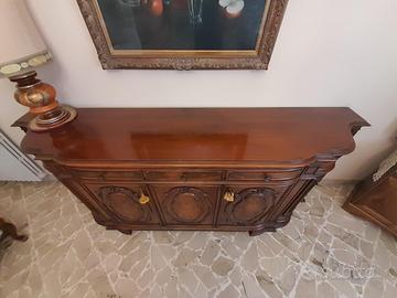 VENDO n.1 Mobile credenza in legno noce massello (ved.foto) Misure: Largh. 2,40 Mt. - Prof. 0.56 Mt. – Alt.1,00 Mt. In abbinamento tavolo rotondo con lo stesso intarsio con prolunghe esterne al tavolo + 4 sedie Poco usato per urgente dismissione arredamento Fare offerta congrua