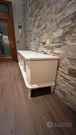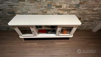 Vendo elegante mobile credenza in legno, finitura bianco opaco, perfetto per arredare soggiorno o ingresso con un tocco di stile shabby chic. Il mobile è dotato di due ante con vetro e chiusura con chiave, oltre a un ripiano centrale a giorno ideale per libri, oggetti decorativi o elettronica.