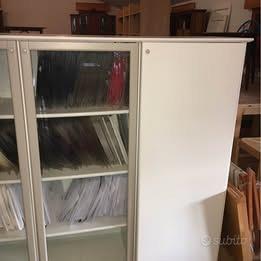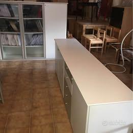 Credenza in legno laccato bianco e grigio nuova a quattro ante con vetrina proveniente da ex mobilificio. Misure: altezza cm. 147, lunghezza cm. 230 e profondità cm. 48.