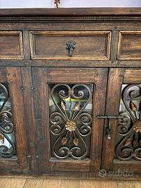 Mobile che ben si adatta a qualsiasi uso, sala, rustico, cucina. 5 sportelli con vetro e lavorazione in ferro battuto pieno, 5 cassetti, legno massello, bello pesante. Prezzo stracciato in confronto a quanto lo pagai!