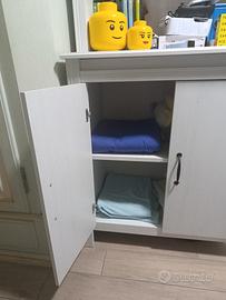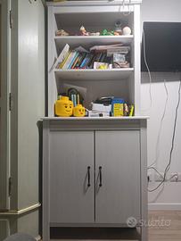 Vendo mobile credenza con libreria della linea Ikea Brusali di colore bianco cenere, composto da due elementi, la parte inferiore ad ante con ripiano interno e la parte superiore a libreria.