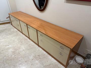 Vendo spazioso mobile basso a quattro moduli, ideale per ingresso, corridoio o zona living. Il mobile si distingue per il suo design lineare e la grande capacità contenitiva, perfetto per chi cerca un elemento d'arredo funzionale dal gusto moderno/contemporaneo. Caratteristiche principali: Struttura: Finitura color legno caldo con top superiore ad alta resistenza. Frontali: Ante e cassetti color crema/beige con eleganti maniglie cromate a semicerchio. Configurazione: * 2 ampi cassettoni laterali (uno a sinistra e uno a destra). 2 vani centrali con apertura ad anta. Stato: Il mobile è in ottime condizioni estetiche e strutturali, ben tenuto e senza graffi evidenti. Ritiro: A carico dell'acquirente