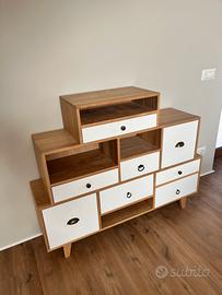Mobile ingresso-soggiorno Maison du Monde. Laccato bianco e legno chiaro. Otto cassetti.