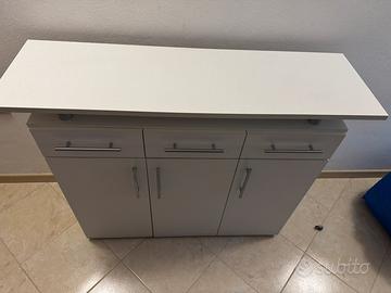 Vendo pratico e moderno mobile contenitore di colore bianco, ideale per soggiorno, ingresso, corridoio o ufficio. Il design è caratterizzato da un elegante piano superiore rialzato su supporti satinati, perfetto per creare un effetto leggero e moderno.