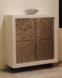 Credenza RIFLESSI modello “Picasso” in legno bianco poro aperto, ante in acciaio martellato, ripiani in vetro e piedini air h 12 in alluminio cromato. La madia è dotata di ripiani in vetro.