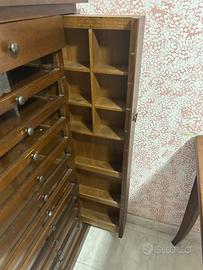Mobile in ottime condizioni, 12 cassetti e due ulteriori scomparti verticali in legno e vetro Dimensioni: altezza 130, larghezza 87, profondità 39