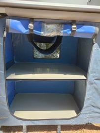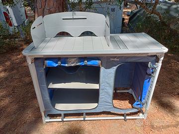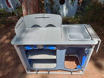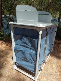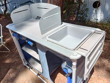 Mobile cucina campeggio, con struttura in acciaio ed angolari in Abs, piano di lavoro arrotolabile, in alluminio verniciato a polvere e telo di copertura in poliestere. Bacinella laterale che può essere ricoperta dal piano di lavoro quando non viene utilizzata. All'interno ripiani per la sistemazione delle stoviglie. Completo di paravento e sacca per il trasporto. Prodotto originale Brunner. Buonissime condizioni, solo un po' scolorito.