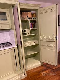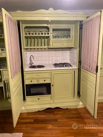 Mobile cucina a scomparsa in legno verniciato a mano colore verde chiaro. Mobile composto da tre elementi, due colonne laterali con ripiani e cassetti. In una delle due colonne è presente nell’anta un tavolo ribaltabile e due sgabelli pieghevoli. Il corpo centrale con apertura ad ante in legno e vetro a scomparsa, accoglie un piano cottura, lavello in acciaio inox, forno e frigorifero. Compresa cappa e piattaia.