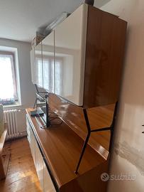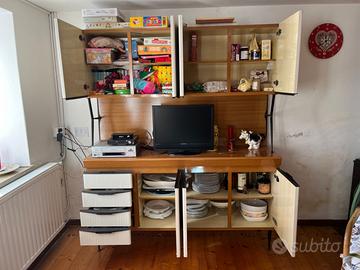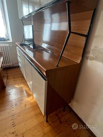 Mobile Cucina Salvarani ORIGINALE anni '60 in legno e formica, misure: altezza 188,5, larghezza 159, profondità del piano appoggio 46, profondità pensili 43 cm. Il mobile ha 7 ante con ripiani interni e 4 cassetti. le gambe e i supporti laterali per i pensili sono in metallo verniciato (nero).