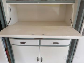 mobile cucina vintage, anni '50,colore bianco e verde, misura 245x44x180, usato. il fianco misura cm 44, cassetti bombati misura cm 40, la ribalta in centro misura lunghezza cm 99 x 38 di prof. presenta dei piccoli difetti nella verniciatura.